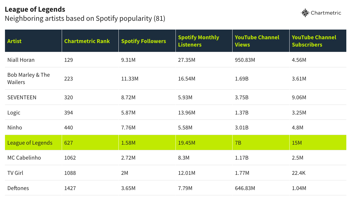 Nowadays, many video game companies are taking the role of record labels to release original music for their games and achieve commercial success along the way. League of Legends is the highest-ranked video game artist on Chartmetric with a Spotify popularity of 81–the same as established artists like Bob Marley & The Wailers and Deftones. The game features multiple official virtual bands that release music under Riot Games and have garnered millions of followers off the game ecosystem.