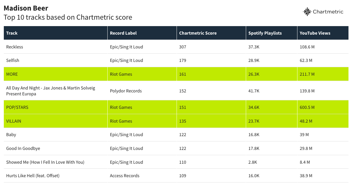 Beyond the popularity of original gaming scores, artists of all genres are seeking features on video games and seeing impressive results. American pop artists Madison Beer and Bea Miller are two examples of this phenomenon. The Gen Z singers have been the voice for Evelynn of K/DA, one of the official League of Legends virtual bands. Both artists have Riot Games songs in their top 10 tracks and saw spikes in their metrics following game music releases.