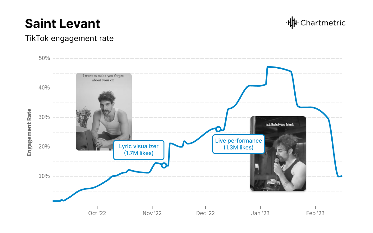 It all started on TikTok. Saint Levant’s TikTok engagement rate experienced a slight boost in mid-September, and his follower count growth remained constant until early October when he observed a slight lift. After teasing “Very Few Friends” for the first time in a late October 2022 video that has surpassed 4.3M views, his TikTok followers grew from 155K to 232K in just nine days. By release day, his hype was already soaring on TikTok, and the timing for a release was perfect, helping his TikTok following increase 5x in the span of two months.