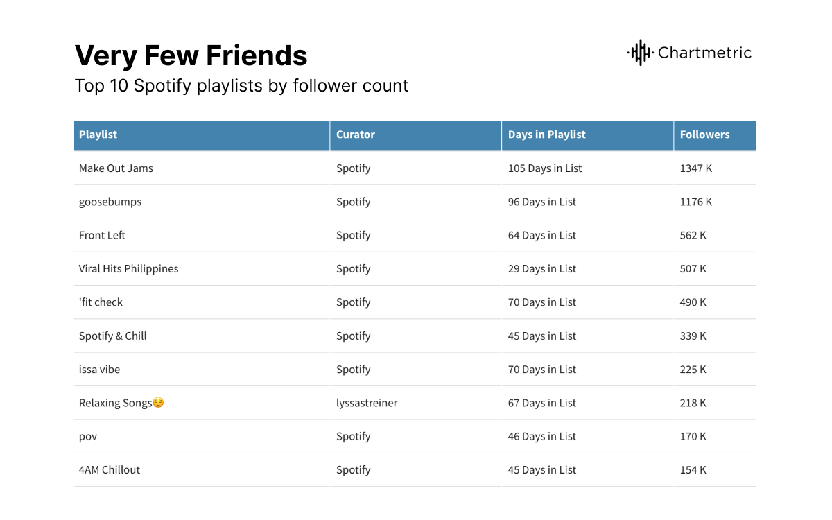 A song going viral on TikTok doesn’t always translate to cross-platform success, but when “Very Few Friends” went viral on TikTok, it quickly attracted listeners on Spotify. The track peaked at No. 2 on Spotify’s Global Viral 50, had 67 entries on all Daily Viral 50 charts, and peaked at No. 1 in 19 countries and No. 2 in the US. The tracks’s streaming success helped it land on big playlists, including New Music Friday in 37 countries, big on the internet, and Pop Rising. This boosted Saint Levant’s playlist reach from 580K to 35M by December. On Jan. 12, “Very Few Friends” was on 35 editorial playlists.