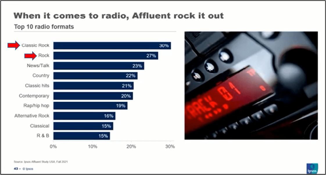 Ipsos presented a recent webinar that drove home the fact that the more you rock, the more income you make. The favorite radio formats of the affluent (household income of at least $125,000 per year) fall in this order. The percentage represents how many affluents consider each format to be a key choice: