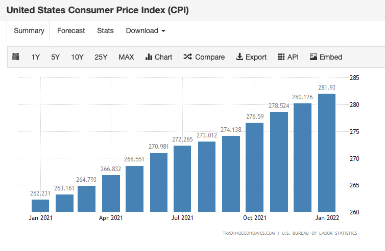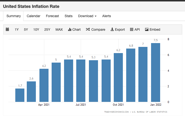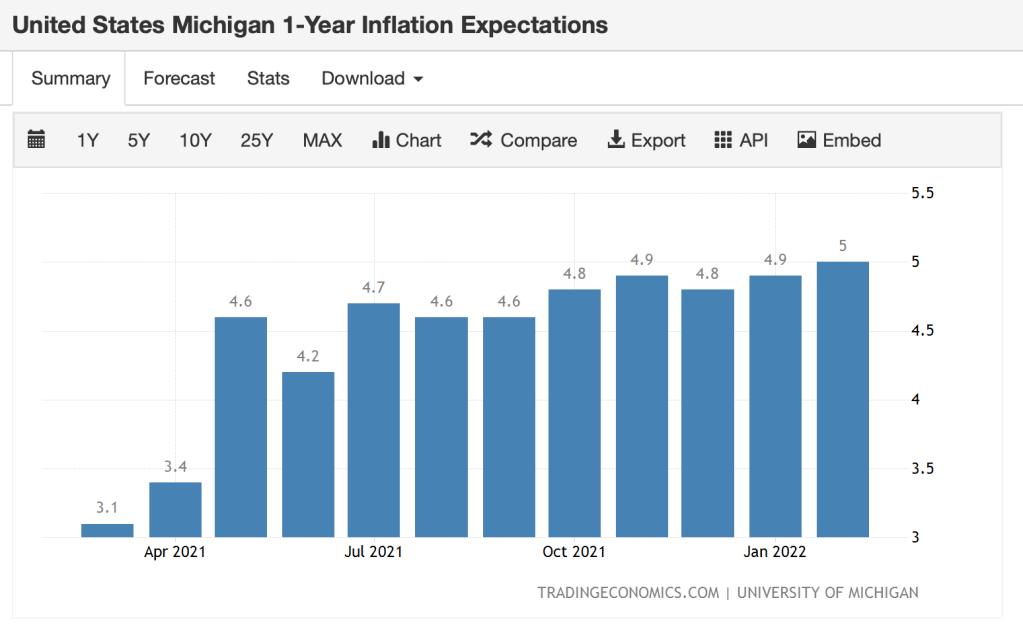 Determining inflation expectation requires survey data, and the benchmark surveys of consumer sentiment and inflation expectations are conducted by the University of Michigan. US inflation expectations for the next 12 months rose to 5% in February of 2022 from 4.9% in January. That is the highest level of 1-year Inflation expectations since July of 2008.