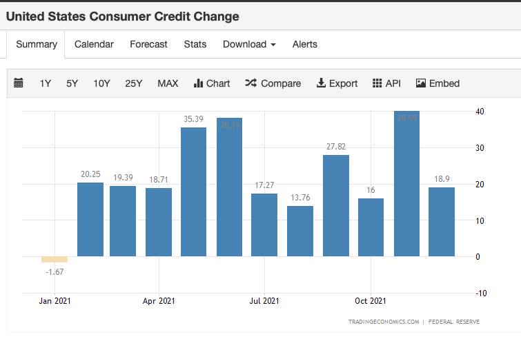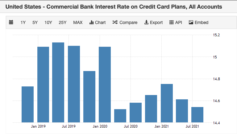 Speaking of the government’s credit card, it is important to look at the effect that inflation has on interest rates for another reason: many people have been dealing with the cost of inflation is by putting it on the credit card. Not everyone has a seven figure base salary.