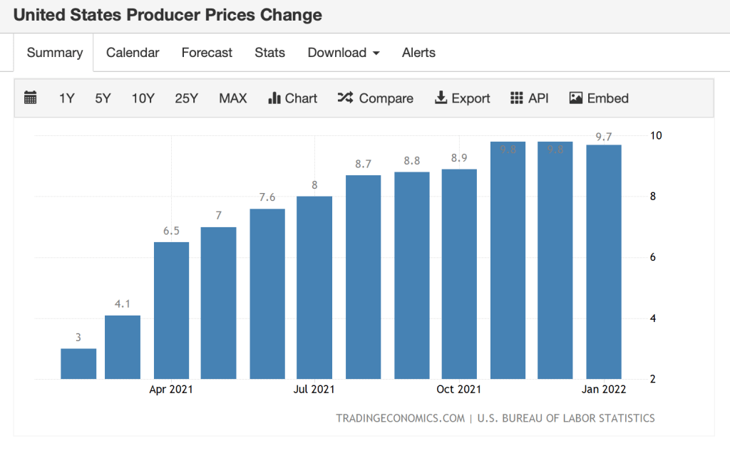 The Producer Price Index rose 1.9% in January to 9.7%. Remember, the PPI is a leading indicator of future inflation because producer prices foreshadow increases in future goods as lower priced inventories decline and price increases are in part passed through to consumers (or are in part absorbed by firms to sustain demand).