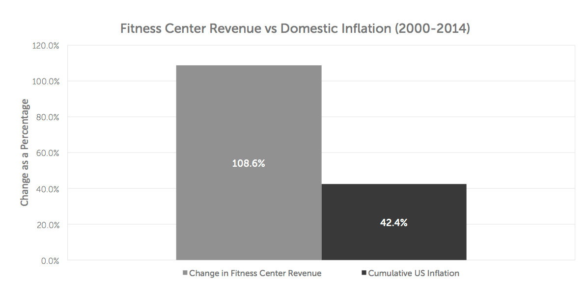 Licensing Fee StructureAs part of its filing, SoulCycle listed total revenues of almost $112 million in 2014 based on 36 existing locations, with projected 2015 revenues of closer to $140 million. The filing predicts an expansion to 250 locations in the near future and thus, if per location revenue of $3.1M holds, the company is expecting annual revenues of at least $775 million. Not only is revenue growing rapidly, but the company’s profit margins (23% in 2014) were described as “fat” in a recent New York Times article.Currently, BMI’s music license for fitness clubs states that the maximum fee for a gym like this shall not exceed $2,123 per year. This fee represents .01% (that’s 1% of 1%) of a single location’s class revenue alone, barely a rounding error. Surely, this is an unusually low fee for “the most important part” of what they do.At ASCAP, they also license SoulCycle and other fitness clubs on a flat fee, per location. While rates increase according to an inflation index, they do not take into consideration the premium fees paid by a SoulCycle member or the direct nexus of music and exercise at these facilities as opposed to background music heard at a more traditional health club or gym.More broadly, looking at several different sources, fitness center revenue has increased over 104% in the US between 2000 and 2014, far outpacing domestic inflation, which has grown only 48% during that same period.