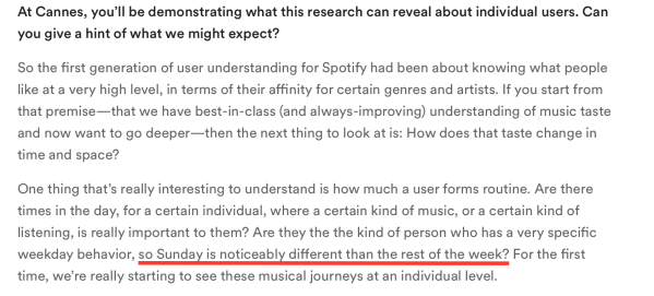 Most people are sophisticated enough to understand the difference between a public and private post. We live in a relatively free country where political dissent is tolerated; religious persecution is largely unknown and people do not need to hide their sexual preferences from the police. But in some countries if certain private information becomes public you could die.That is why I don’t understand why Spotify for Brands would brag about data harvesting of this kind: