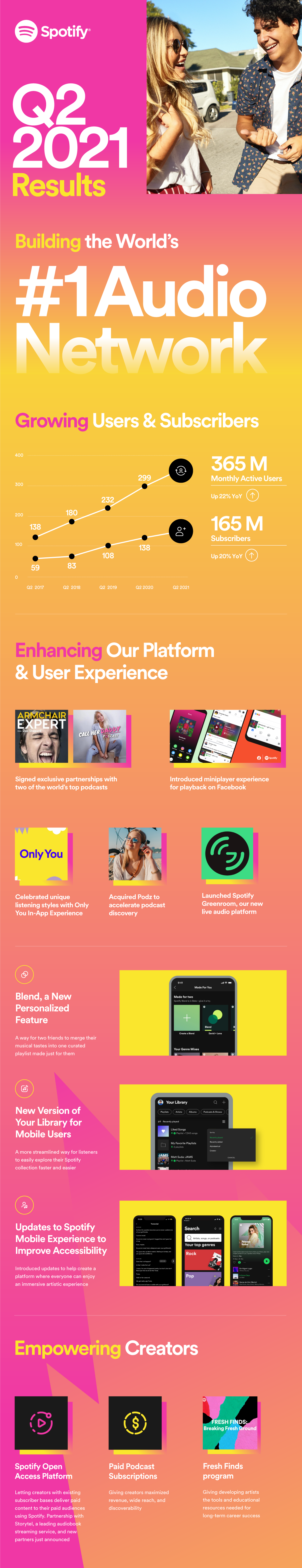 A graphic produced by Spotify for the Q2 earnings announcements shares user stats and touts new features.