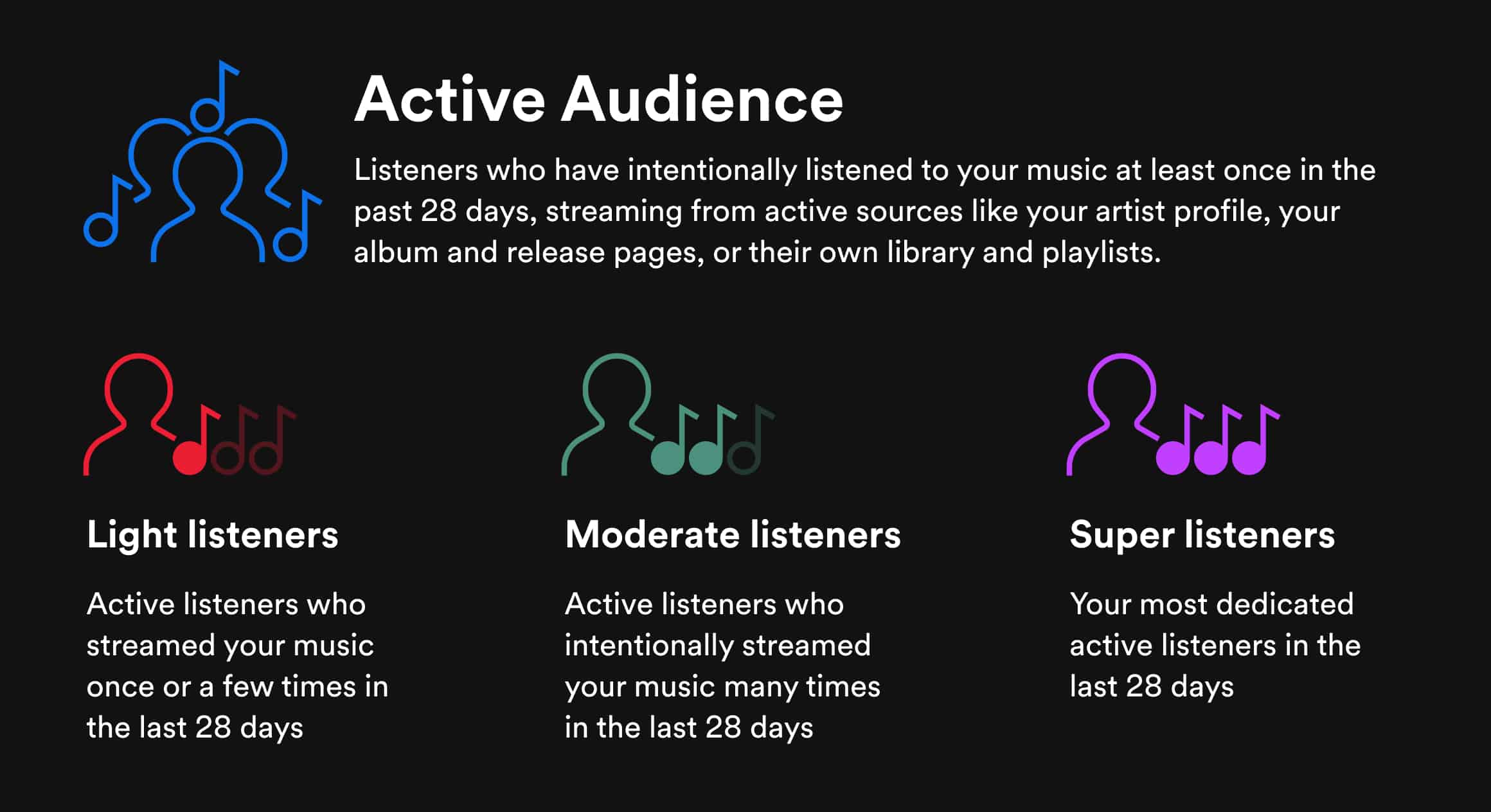 - Super listeners: An artist’s most dedicated active listeners in the last 28 days. “They are also the most likely to keep streaming the music,” according to Spotify.
