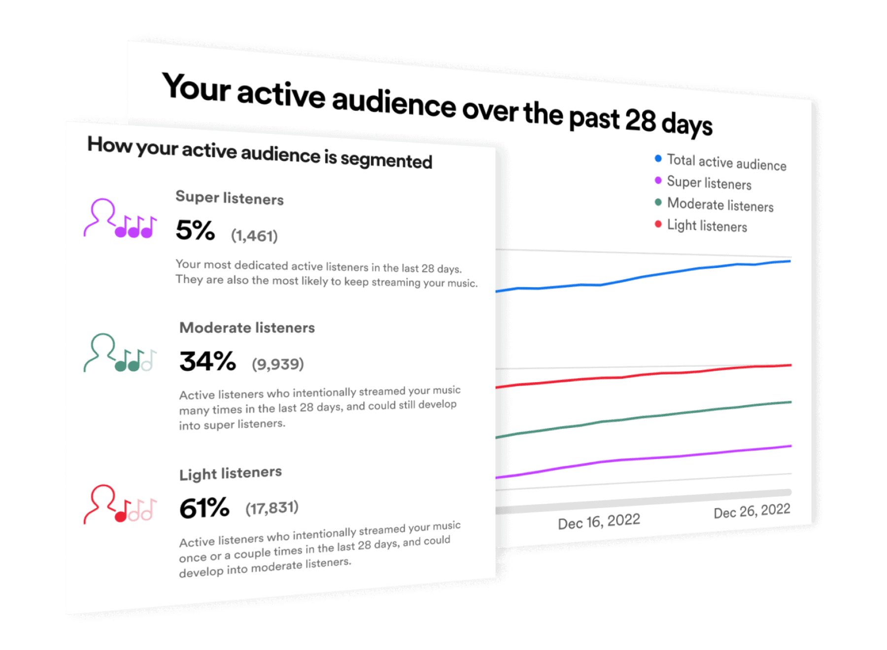 - Light listeners: Active listeners who intentionally streamed an artist’s music once or a couple of times in the last 28 days and could develop into moderate listeners.