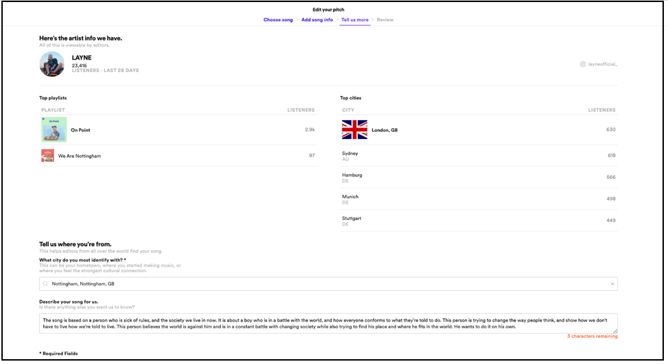 With a 500 character count limit you’ll have approximately 5-6 sentences to get this down. When you write your note, keep in mind that it will be read by the editors themselves. Don’t try to be a publicist or preachy, just be honest and true to the artistry behind your music. What inspired you to write this? Did you learn anything in the process? Are there any musical references or samples? Be nerdy and show off your personality. If you have space leftover, mention upcoming press/shows you’ve secured.