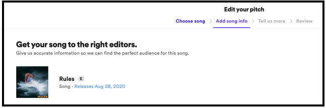After you pick your song to pitch, you’ll be asked to tag your release with basic info such as genre and metadata. Make sure this is as accurate as possible. No, don’t be clever or punk rock about it.