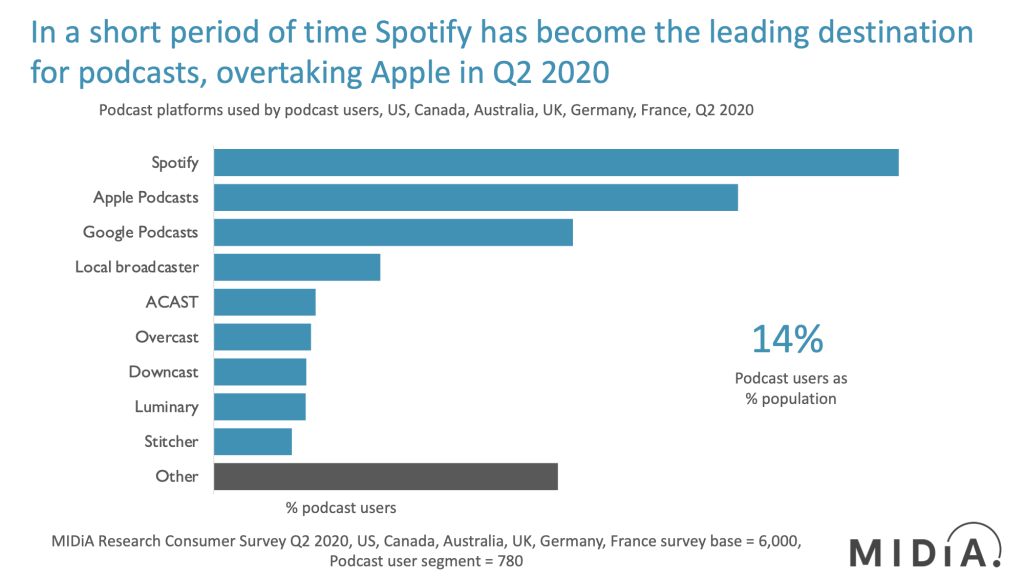 MIDiA just published its latest Podcast report, Podcasts Q2 2020: Spotify Takes an Early Lead. In it, we present data from MIDiA’s quarterly survey that presents a comprehensive view of podcast user behavior, who podcast listeners are, how it stacks up against radio and music streaming listening and which platforms listeners are going to for their podcasts. One of the key findings of the 3,000-word report is that Spotify is now firmly established as the most widely used podcast platform.