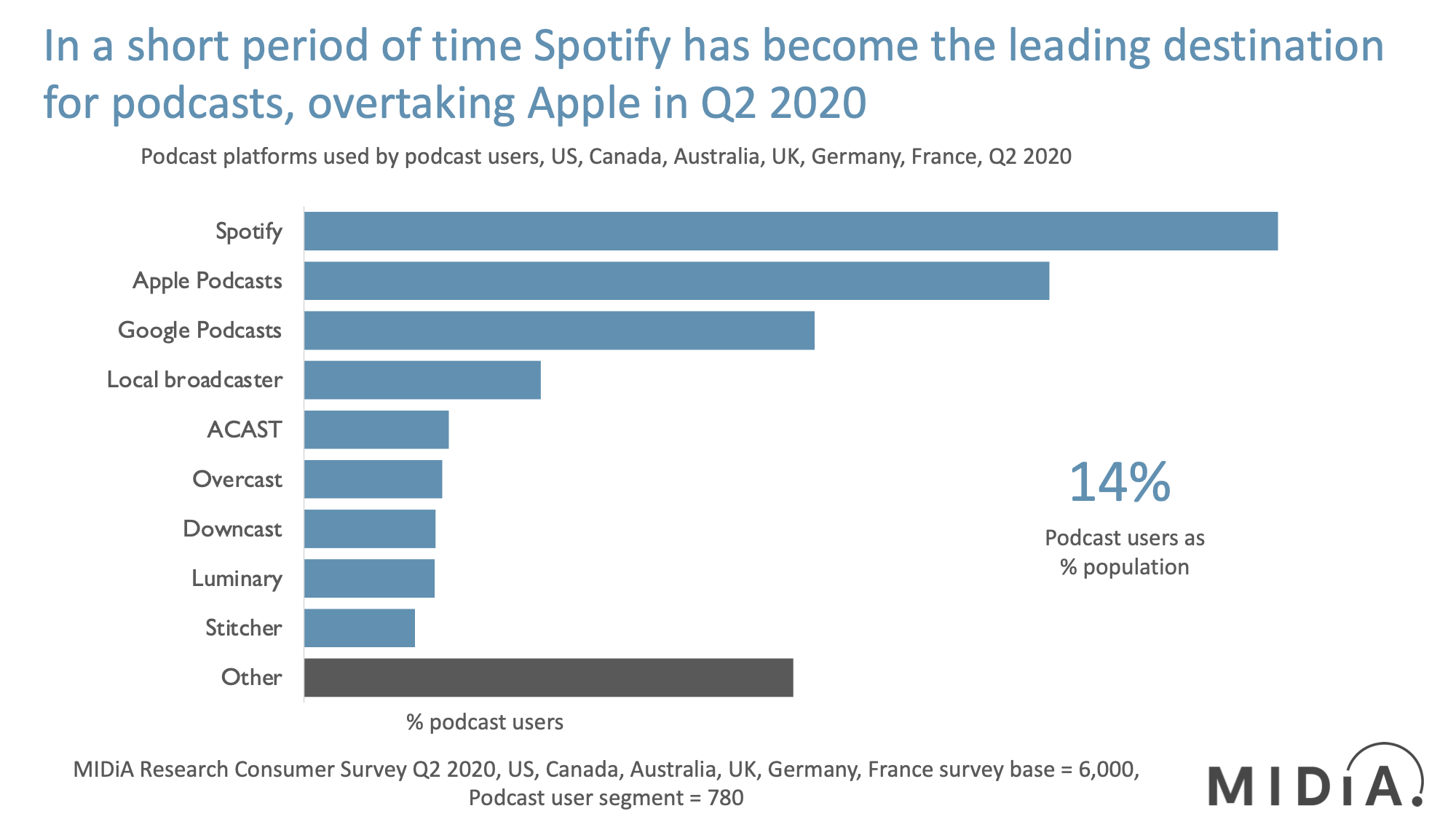 A new MIDiA report shows Spotify passing Apple to become the most popular destination for podcast listening.