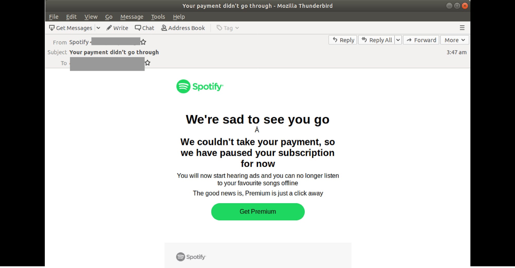 “The malicious emails arrive in inboxes using the display name ‘Spotify’ and are titled ‘Your payment didn’t go through’. The body of the email contains the Spotify logo. It informs recipients that because their payment wasn’t accepted, their subscription has been paused. As a consequence, ‘you will now start hearing ads and you can no longer listen to your favourite songs offline’. To fix this problem, a button is provided with the words ‘Get Premium’.