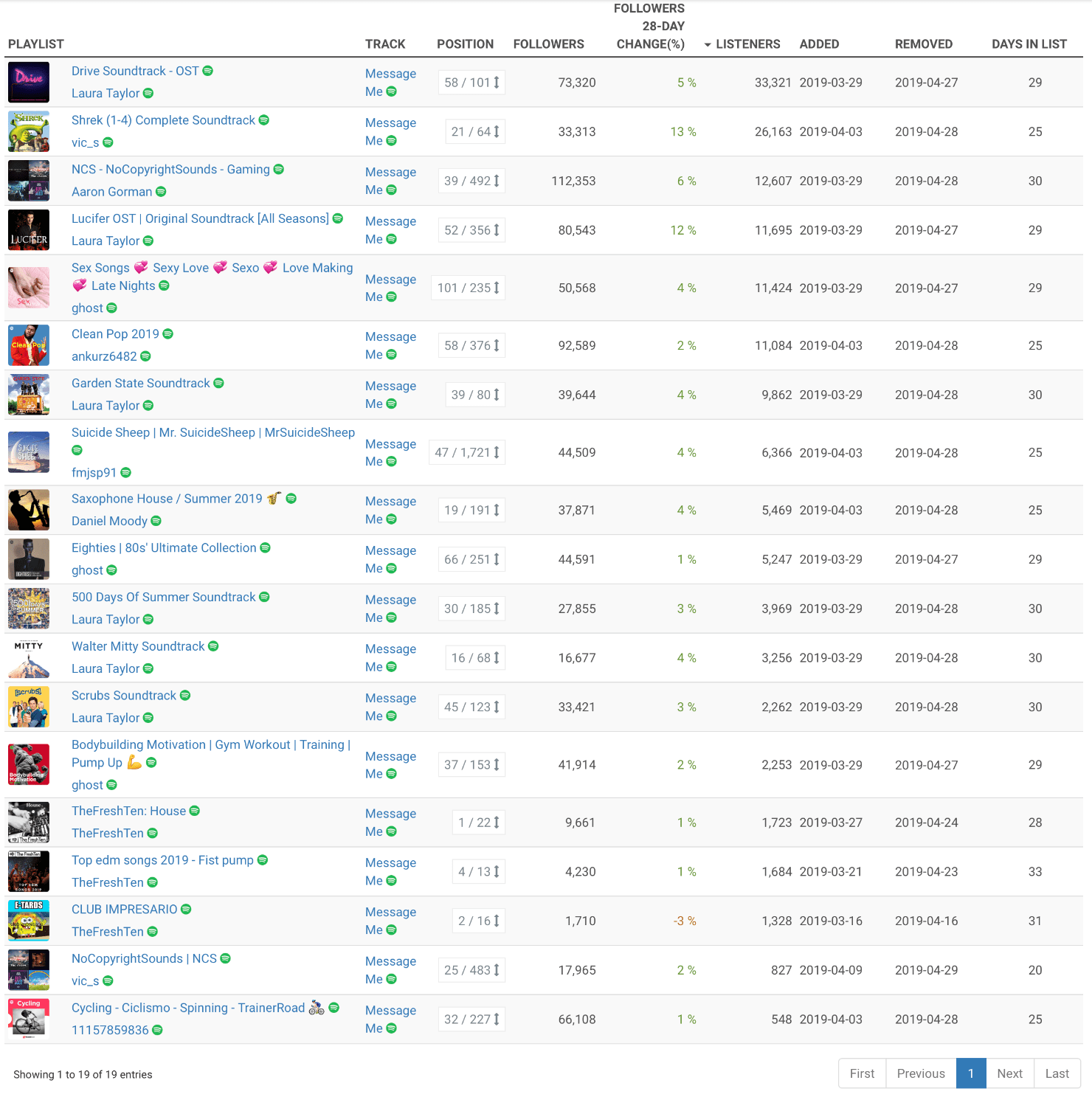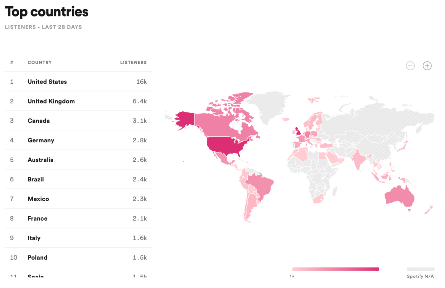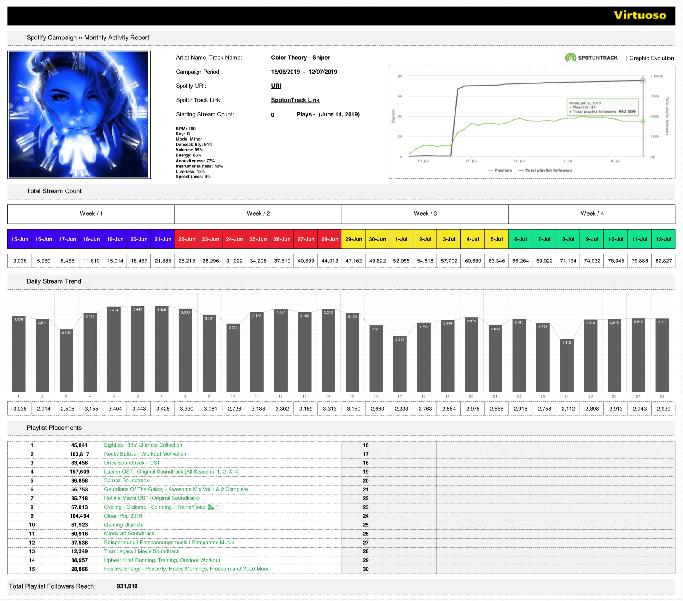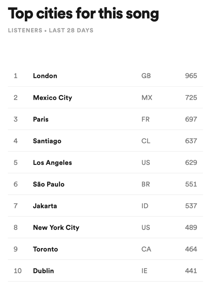 Four days after paying, my campaign started off with a bang! Four weeks later, it ended with a whimper.What I mean is, my song was added to all the playlists on day one, and removed from all of them on day 29. With a few minor exceptions, the campaign was perfectly choreographed.Here’s a list of past playlists from Chartmetric, the day after the campaign ended. All but one of the placements were through Virtuoso.Note the number of listeners for each playlist, and the reasonable follower growth. Looks legit so far.That’s a lot of streams! For me, anyway.The country breakdown looks not only legit, but desirable. Historically my top fan locations are US, UK, Sweden, Germany, and Canada.The city breakdown looks solid too. Big, recognizable cities in the top countries listed above.Here’s the report provided by Virtuoso (click to enlarge):Did they deliver what they promised? Hell yeah!Would I do it again? Yes, I would. In fact, I did, with this song:And again, my song was insta-added to 15 playlists, including many of the same ones, and dropped like a bad habit the day after the campaign ended.Here’s the second report from Virtuoso (click to enlarge):As you can see, the results were very much in line with my first campaign.To summarize, both campaigns yielded approximately 90K plays in four weeks for $800.That’s a lot better than I expected going in!My second campaign ended in July, but I waited until I received royalties for the first one before writing this article. I estimate I received $400 as a result of that campaign.