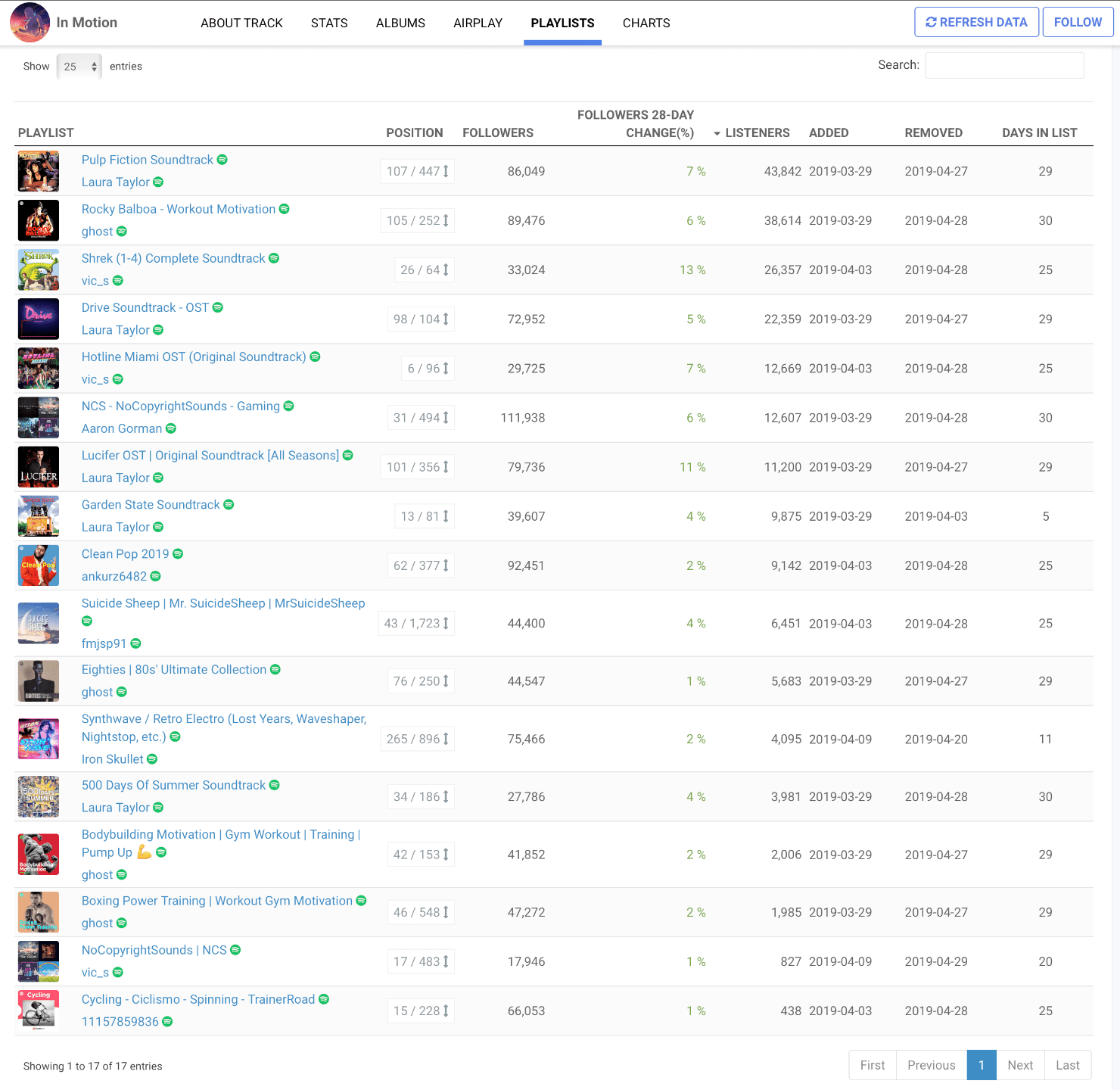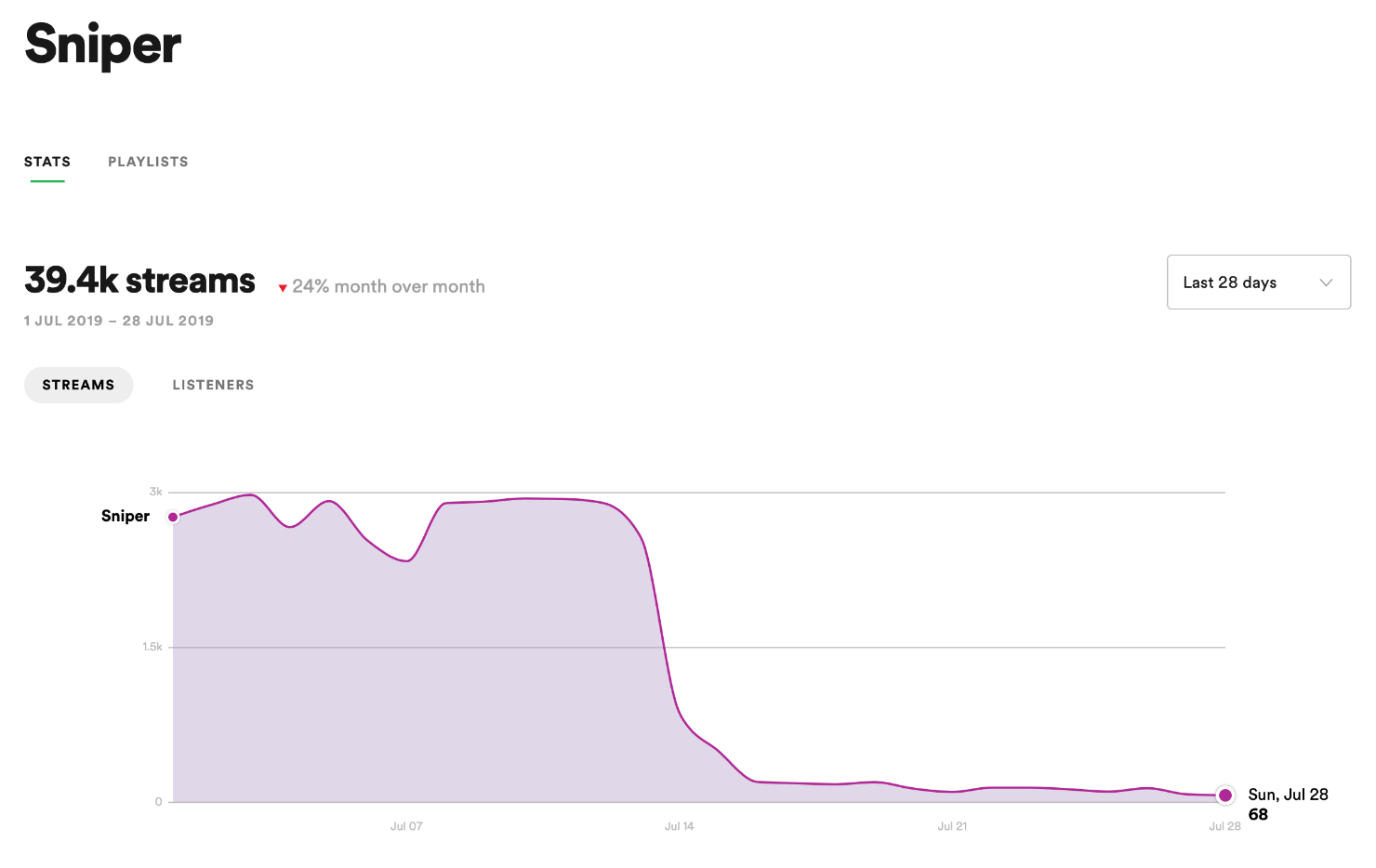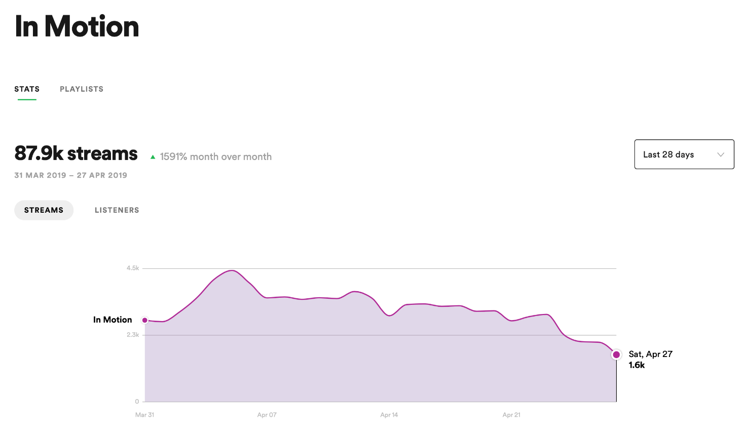 Looking at the first campaign, maybe five of the playlists are logical choices. Only Suicide Sheep and Eighties Ultimate Collection are center of the bullseye, setting aside the fact that my song isn’t actually from the 80s.Bottom line, these aren’t the sorts of playlists fans of my genre listen to for discovery.Midway through the first campaign, November47 messaged me on Facebook to ask if I was testing Virtuoso, after noticing we were on a lot of the same playlists, so I looked his track up on Chartmetric.Here’s it is:As of today, both he and the other artist on the track are hovering around 230 monthly listeners, so clearly the campaign didn’t have a lasting effect.He describes his experience thusly:Since our campaign ended, they took us out of all but a handful of playlists (4 or 5 I think). We’ve gotten almost zero plays outside of that – maybe 20+ plays per month that are organic. It didn’t do us any good AT ALL. Well I guess 69,000 plays still looks better than “< 1000” but that would only matter if anyone were aware of it – which was the reason we used them in the first place. I, on the other hand, was unceremoniously dropped from all of the playlists both times.You may have noticed that most of my plays came from the same three curators: Laura Taylor, ghost, and vic_s. That’s not necessarily a problem, but it prompted me to ask Virtuoso if they owned the playlists. They confirmed that they “don’t have direct access to these playlists.”One of my tracks was on Laura Taylor’s Drive Soundtrack for awhile last year, with no promotion, so I know at least back then she was actively curating.Clearly there’s more detective work to be done, if one were so inclined.Okay, so I can’t expect algorithmic plays, but does it really matter if I’m making new fans?That’s the thing — I didn’t actually make any new fans that I can tell.I added 73 new followers over the course of the 28-day campaign. Right now I don’t have any sort of promotional campaign going, and I gained 65 followers over the past 28 days.Each of my two tracks got approximately 1.8K saves, but in both cases the streams came to a halt once the campaign ended.I have little reason to believe the trajectory of my career was altered in any meaningful way.