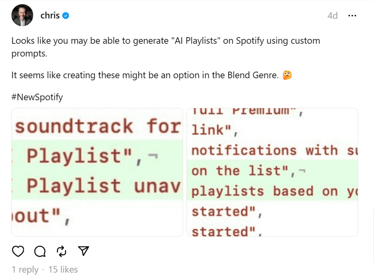 Code pointing to prompt-driven AI playlists was discovered within the Spotify app by tech investor Chris Messina, who posted screenshots.