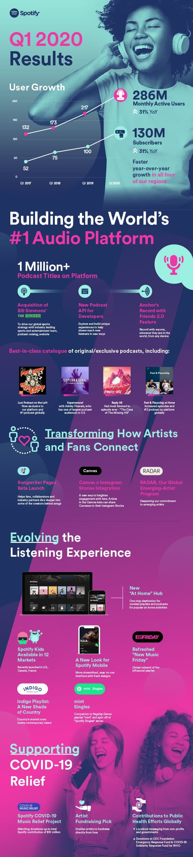 Spotify’s Q1 2020 report to shareholders included an infographic that shares the streamer’s recent growth and top initiatives.
