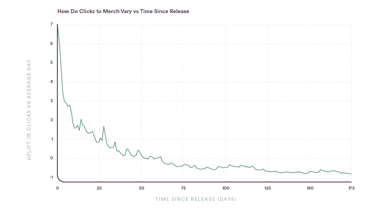 When we look at the first six months after a release, on average we see that fans view merch 7.2x more on release day vs. other days, 4.0x more in the first week vs. other weeks, and 2.1x more in the first month vs. other months.