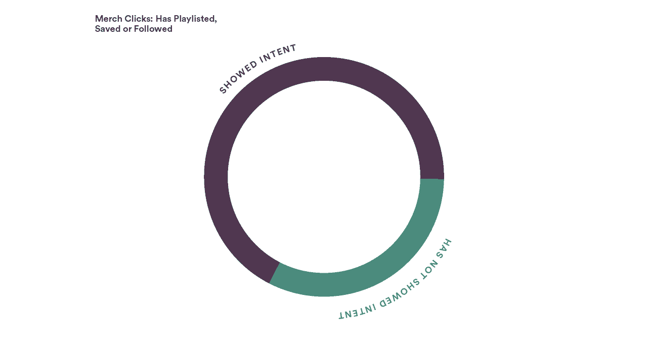 It comes as no surprise that diehard fans of your music are also diehard fans of your merch. But our data shows that making even the smallest connection with fans can have a big impact on their engagement with your merch. For example: Fans who have followed an artist, playlisted a track, or simply liked a track account for more than 67% of fans clicking on that artist’s merch.