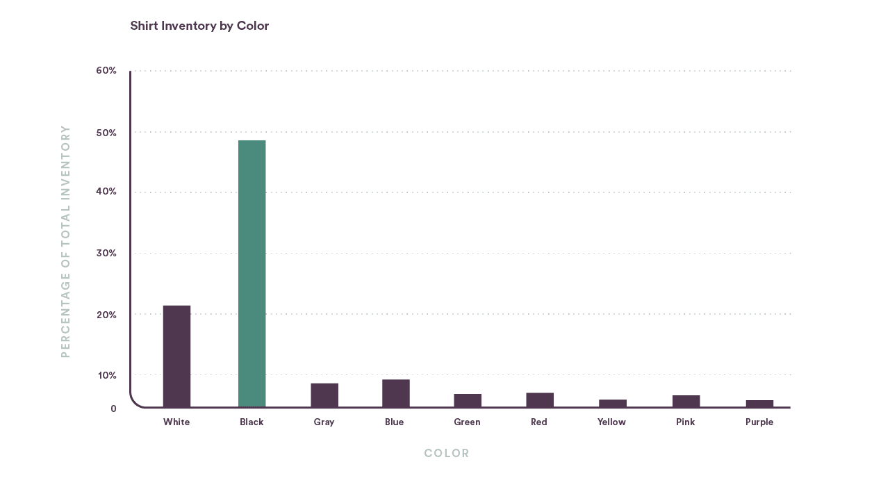 But when we did a little browsing of our own, we were surprised to see that nearly half of all the T-shirts stocked by artists on Spotify are black. And if you add white and gray shirts into the mix, that number goes up to nearly 80%.