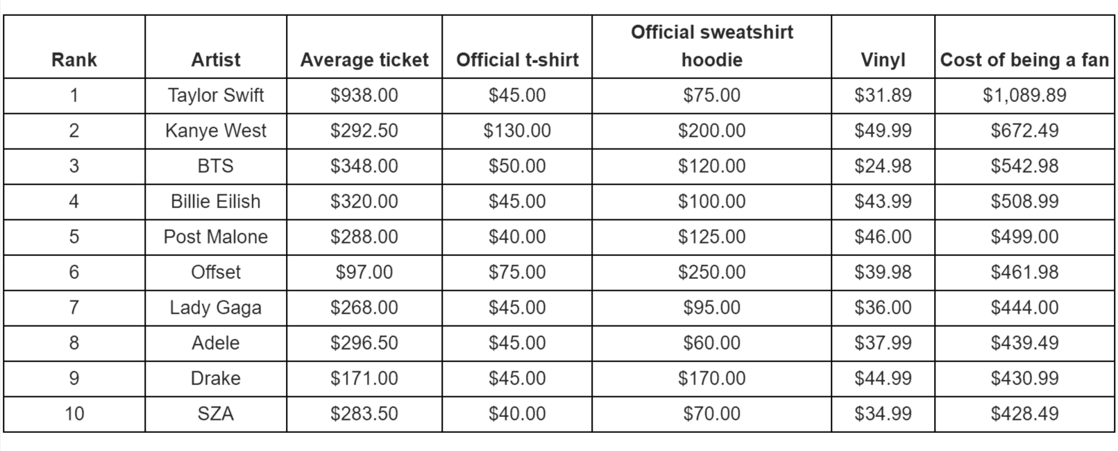 - Taylor Swift ($1,090) and Kanye West ($672) are the most expensive artists for music fans.