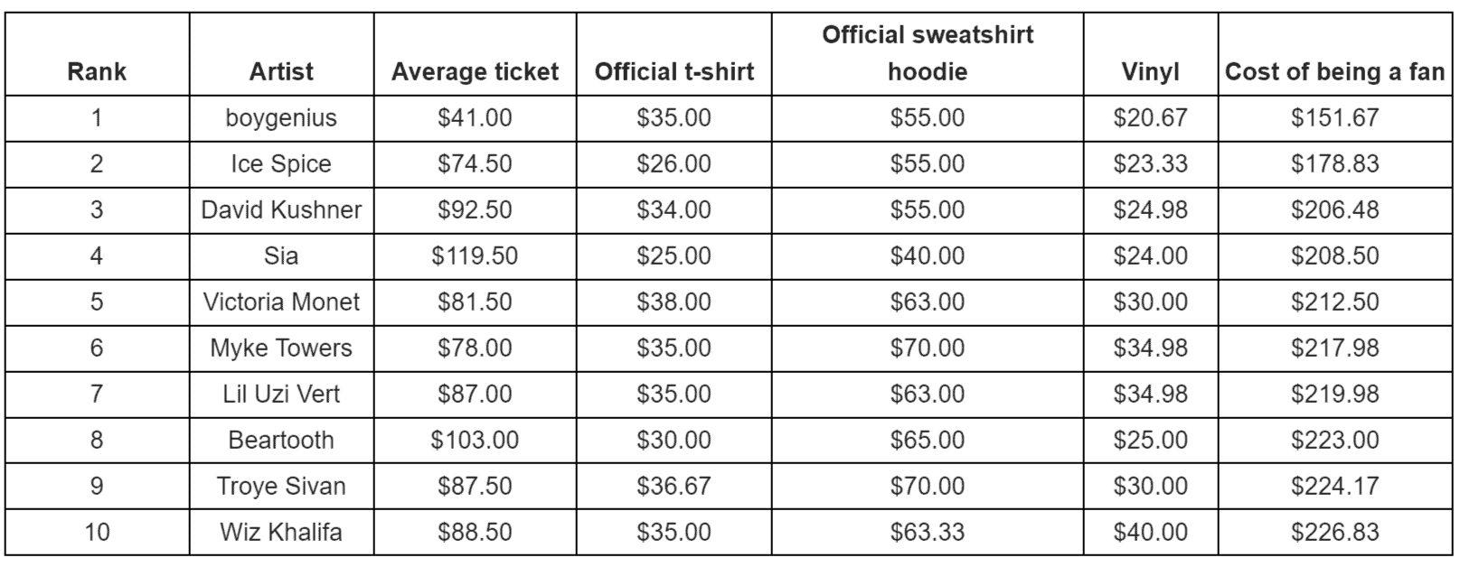 - boygenius and Ice Spice are the “best-value,” costing fans an average of $152 and $179 for tickets, merch, and vinyl, respectively.