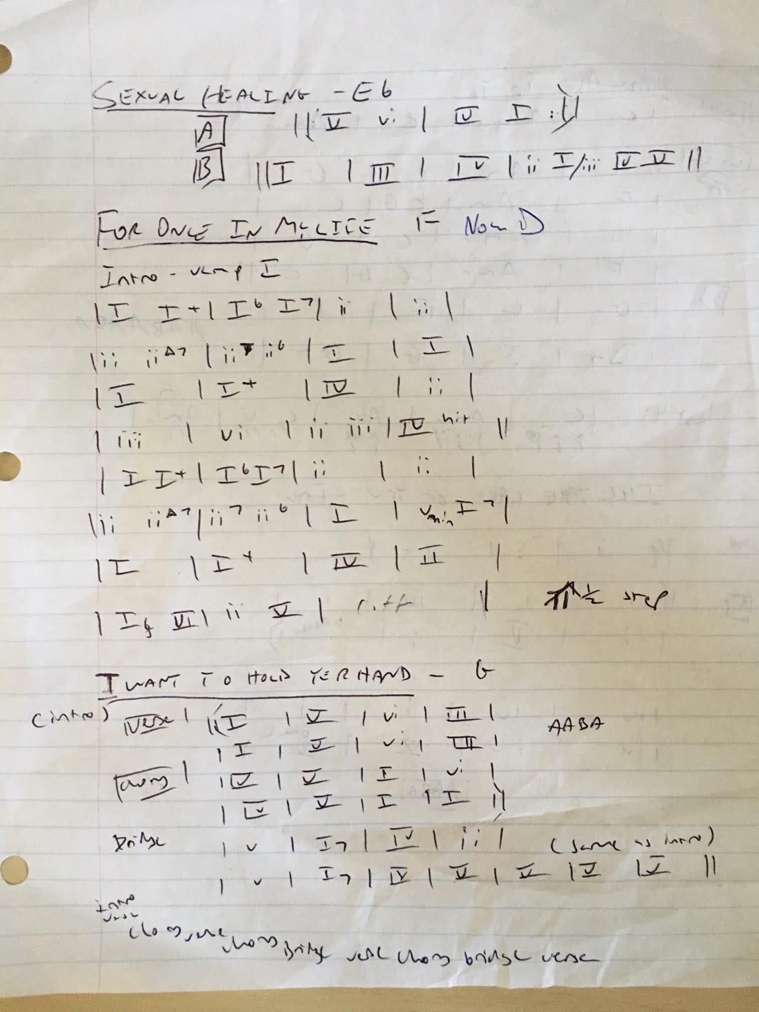 I think this is an important step, although the level of detail that goes into each chart can vary from person to person. Personally, writing things down helps me remember them. I don’t like reading charts at gigs, mostly because I feel that it takes away from the performance aspect. (We’re putting on a show, after all!) I’m not, however, opposed to other musicians reading at gigs if they need it. Charting the chord structure, making note of any special or iconic riffs on my instrument, helps me recall the structures while I’m in performance mode.Here’s a picture of some charts I jotted down for a recent performance. I wouldn’t expect others to feel that these are a complete portrait of the songs or be able to use them in any functional way. But after having spent time learning more specific information in the previous steps, this is enough to keep the music fresh in my mind’s eye and ear.I prefer to use Roman numeral notation instead of writing the specific chords because there will inevitably be a few key changes, and this will mean transposition. I find it easier to transpose chord numerals instead.