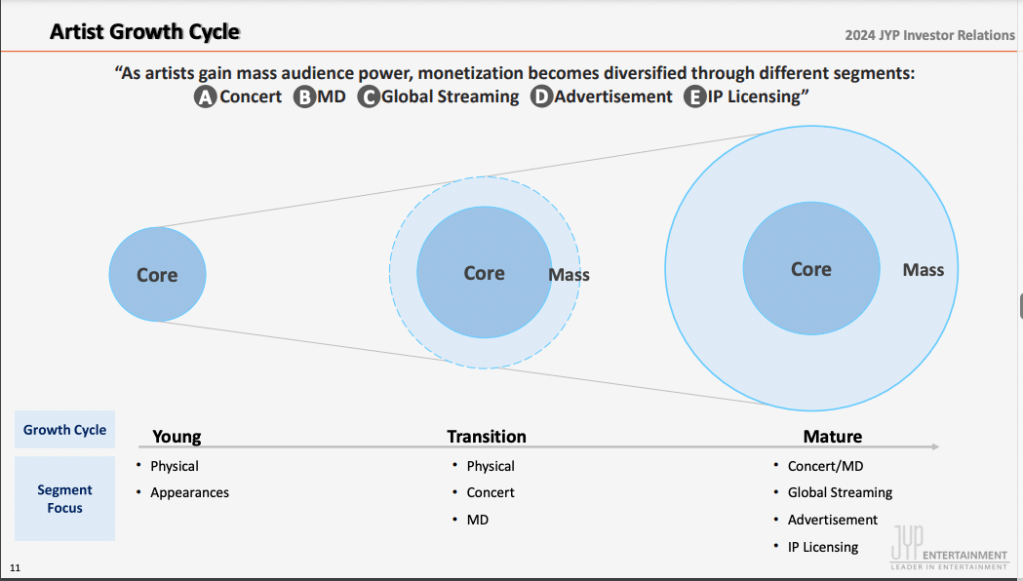 - Nurturing, not harvesting, fandom: There are two dangers inherent in record label superfan strategies: 1) weaned on lean back streaming, superfans might not be super enough, and 2) it is all too easy to focus on monetising fandom rather than nurturing it. As much as Korean labels like HYBE, SM, and JYP might be industrialising fandom and exploiting fans, they at least understand the importance of building and nurturing fandom (take a look at the chart from JYP’s earnings to understand their fandom approach). Record label expanded rights were up 16% in 2023 and will continue to grow strongly. It is incumbent on record labels to consider fans as a scarce resource to be cultivated, not simply monetised, otherwise the soil will be left exhausted and barren.