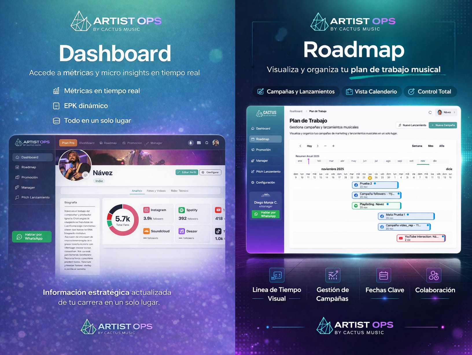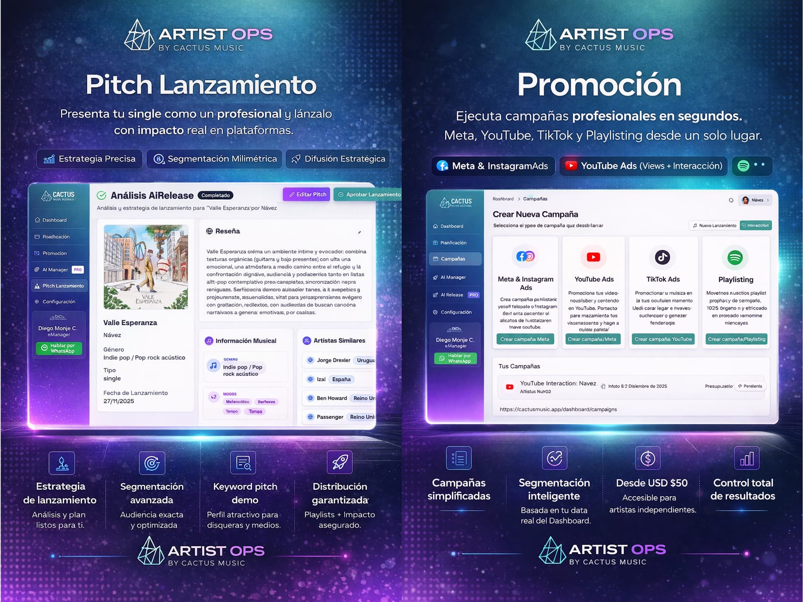 Cactus Music was founded in 2013 in Chile as an independent label focused on developing emerging artists. During its early years, the company worked closely on artist development and release strategies, while building strong international networks through participation in key industry events such as MIDEM, Primavera Pro, Circulart, WOMEX, and SXSW. In 2024, the team launched Artist Ops by Cactus Music, a platform that integrates marketing, data, and AI to support artists and teams in executing campaigns more efficiently.