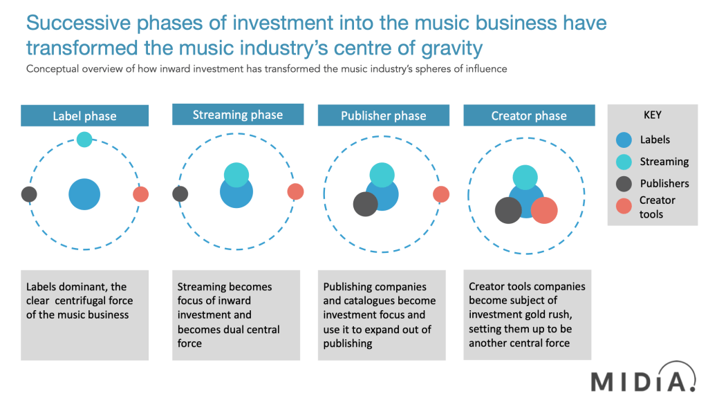Outside of the currently crippled live business, the record labels used to be the undisputed central force of the music business. Then streaming services grew in scale and attracted the first wave of inward investment into the industry. Alongside labels, streaming services became the joint central force of the music business, around which all else orbited. Big investors started to make bets on either side of a binary equation: rights or distribution.