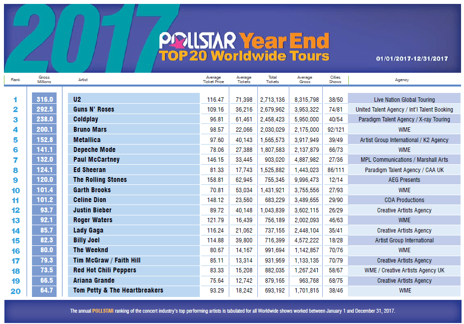 And it’s not just here in North America. A great article in the Irish Examiner – “Music has taken a trip down memory lane”- by writer Ed Power crystalizes many of the underpinnings of music’s nostalgia machine – and its impact on commerce. He notes that concert halls are filling up at record rates by nostalgia-infused acts, highlighted by a Guns N’ Roses comeback, the staying power of U2 (a band that’s now 40+ years old), and a Broadway smash that isn’t a musical, but instead is a ’70s rocker named Bruce Springsteen who’s grossing millions on the stage for audiences that just can’t get enough.How to explain this phenomenon. Power observes, “Today we no longer chase our youth – we chase our childhoods.”Whether its millions of celebrants trying to recapture the Christmas holidays of their adolescence, aging rockers going back to those good old college days, or Millennials trying to understand what all the fuss is about, music nostalgia shows no signs of stopping.Look at this almost-finished end of year list from Pollstar of the top-grossing concerts around the world in 2017 – a record year, by the way. Studying where people are spending their entertainment dollars is part of the analysis This Top 20 list of mostly older performers generated $2.64 billion (with a B) in 2017 – up $241 million from the previous year. The concert experience continues to strengthen, bolstered by bygone acts that include U2, Paul McCartney, the Rolling Stones, Guns N’ Roses, Roger Waters, Billy Joel, and Metallica. Even Tom Petty, whose 2017 was tragically cut short by his untimely passing, made the list.
