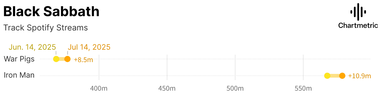 Black Sabbath also saw more streams on the band’s hits, though on a smaller scale than Oasis. Between June 14th and July 14th, “Iron Man” grew by 10.9M Spotify streams while “War Pigs” grew by 8.5M streams.