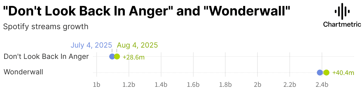 Still, the Reunion Tour Effect led to the faster accumulation of streams on the band’s biggest hits. For example, “Wonderwall” grew from 2.38B streams on July 4th to 2.43B streams one month later on August 4th. That’s an increase of over 40 million. By comparison, the song grew by 27.9M streams between June 4th and July 4th. “Don’t Look Back In Anger” saw similar growth in the month since Oasis kicked off their tour. Between June 4th and July 4th, the track grew by 17.1M streams. But between July 4th and August 4th, the track was streamed 28.6M.