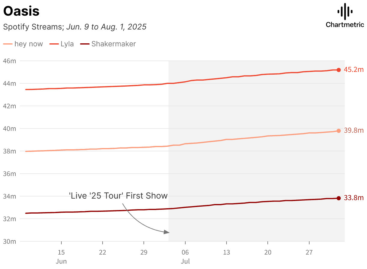 The take away is: the Reunion Tour is driving more listeners back to Oasis music.
