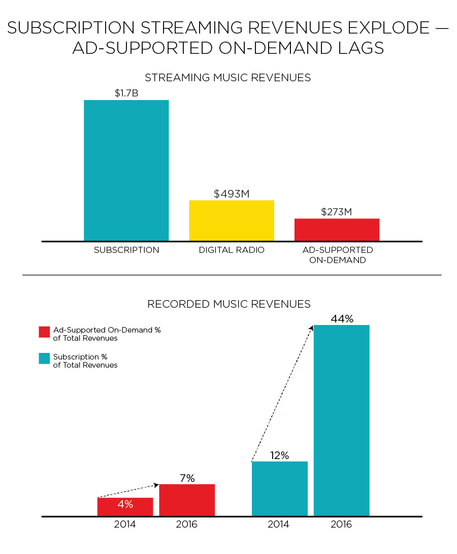 We estimate that there may be a TRILLION streams in 2017, counting both on-demand services and digital radio (some 460 billion in first half of the year). Wrap your head around that staggering number. It is encouraging but also speaks to the foundational challenge that continues to confront the music community. To the fan, there is often little difference between the multitudes of services available, yet the payouts to creators are very different and vastly impacted by outdated or abused laws and regulations.And that’s why a united music community continues to be incredibly animated about music’s “value gap” and calls upon policymakers — and our business partners — across the globe to do better and address these inequities (look no further than the massive response to YouTube’s recent self-congratulatory blog).As you can see from the chart that my colleague Josh included in his summary of 2017 mid-year statistics, the amount of revenues that the three major categories of streaming generated is dramatically different, as is their disparate contribution to overall revenues.