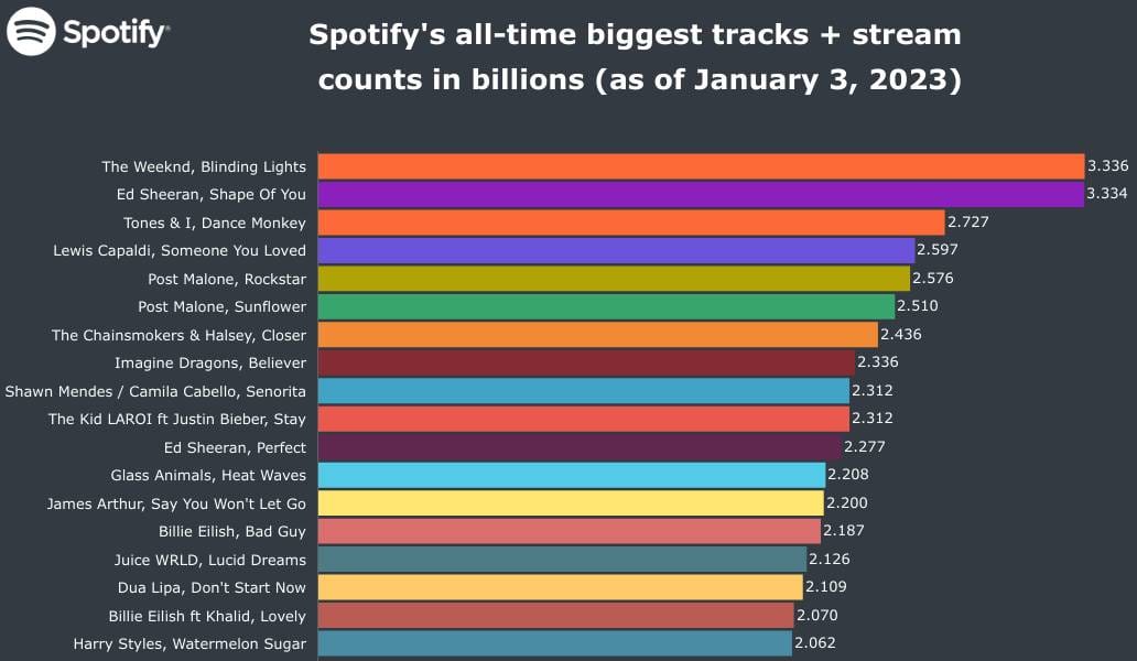 As of January 3rd, The Weeknd’s “Blinding Lights” has racked up 3.336 billion streams, exceeding 3.334 billion streams for “Shape of You.”