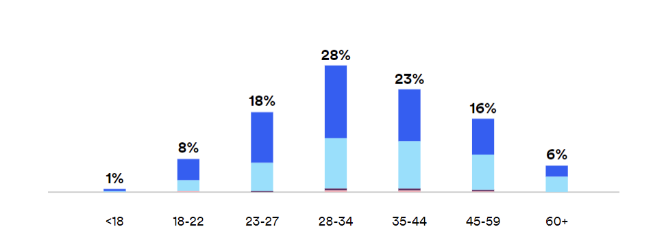 The distribution of age from Spotify for Artists data displayed a broad range of listeners aged 18-59 years old (see chart below) evenly weighted between male and female. Therefore, the initial ad campaign targeted a diverse range of ages to reach a broad audience of Spotify users who listened to Indie Folk and Americana music. The ads were directed to a landing page that was embedded with a pixel to provide insights regarding demographic and geographic profiles. After measuring reach and impressions from the initial campaign, the ads were refined to target users who watched the video or clicked on the ad previously and expand the initial interest audience.