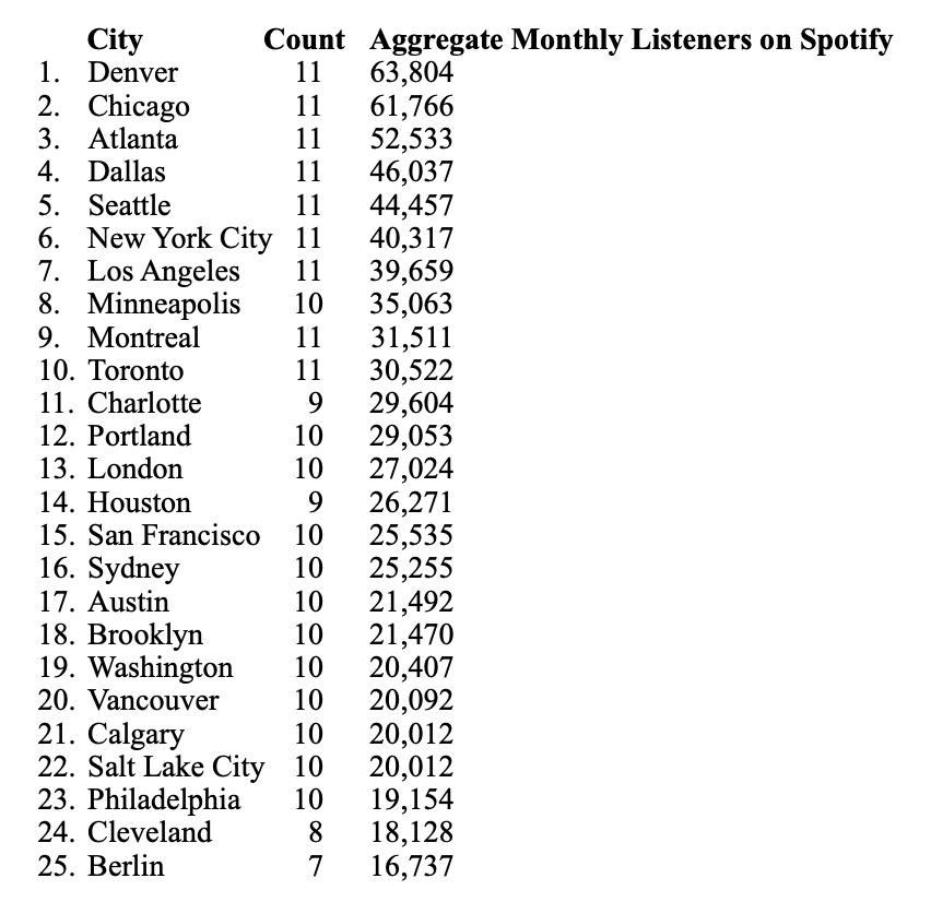 A few notable cities emerged when reviewing the total monthly listeners on Spotify for the Artists: Denver, Colorado (No. 1); Charlotte, North Carolina (No. 11); and Houston, Texas (No. 14).