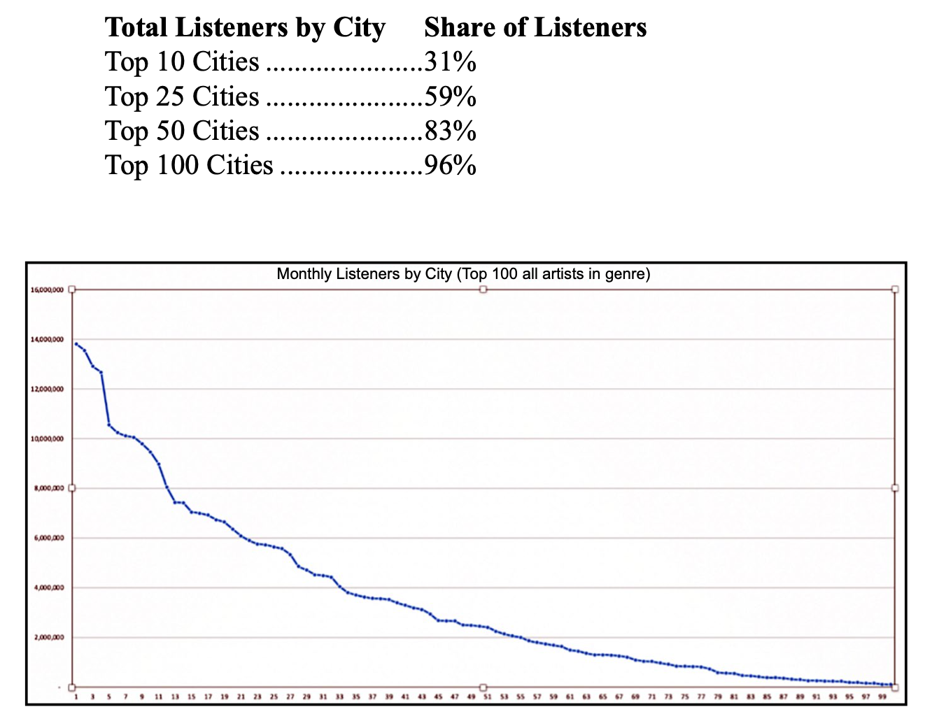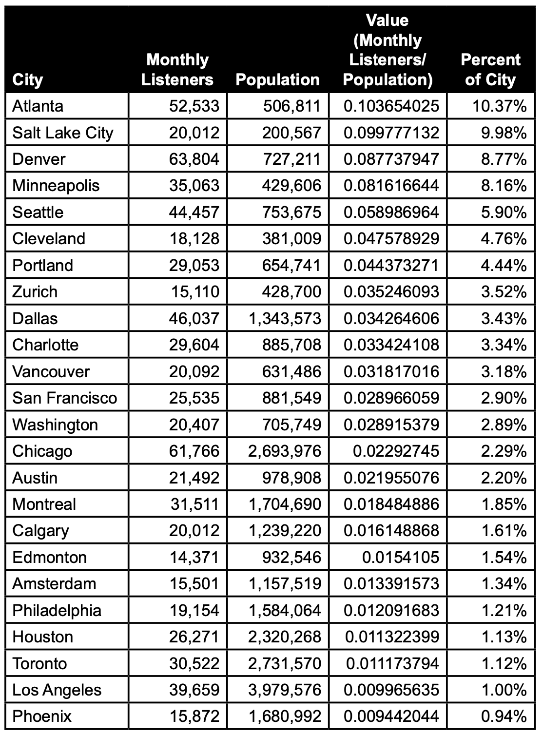 In analyzing the total monthly listeners compared to the corresponding city population, the Artists’ reach over-indexed in Seattle, Minneapolis, Denver, Salt Lake City, and Atlanta.