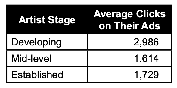 Developing Artists averaged 2,986 clicks during the campaign, while mid-level Artists (1,614 clicks) and established Artists (1,729 clicks) experienced similar engagement. Advertising clearly benefited the developing Artists in this study, as the playing field was leveled in regions outside of the United States.