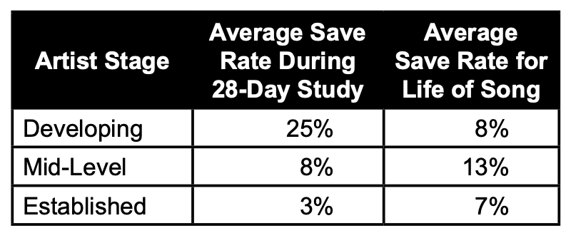 Results indicated that developing Artists received the highest save rate on Spotify for songs used in the campaign, with an average 25 percent save rate, well above the 3-8 percent industry average save rate range. Mid-level (8 percent) and established (3 percent) Artists’ save rates fell within industry averages.