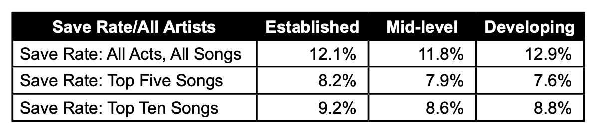 The Artists averaged an overall save rate of 12 percent, compared to just a 6 percent average save rate for the Top 18 streamed songs. Many of the top performing artists receiving editorial playlist inclusion had save rates in the 2-4 percent range. The lower save rate for top streamed songs is largely due in part to editorial playlists’ “lean back” listening experience. Save rate is one of the indicators for Spotify’s algorithmic playlists.