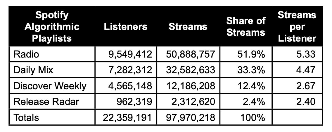 19 percent (108M) of the Artists’ total streams on Spotify were from algorithmic playlists. Algorithmic playlists Radio and Daily Mix had the highest share of streams (85 percent) and level of engagement averaged 5.33 and 4.47 streams per listener. 90 percent of all algorithmic streams came from Radio, Daily Mix, Discover Weekly, and Release Radar.