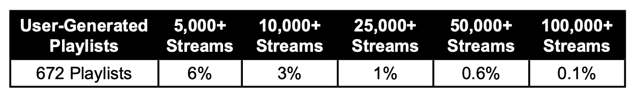 The Artists had a total of 569M total streams on Spotify. Of the 569M streams, more than half (56 percent) came from inclusion on Spotify’s editorial and algorithmic playlists, while inclusion in user-generated playlists was virtually inconsequential with an exception for developing Artists’ streams.