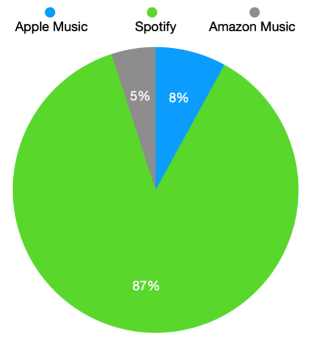 The Artists generated a total of 569M streams on Spotify, Apple Music, and Amazon Music Unlimited, with 87 percent derived from Spotify and only 13 percent from Apple and Amazon (8 percent and 5 percent, respectively).