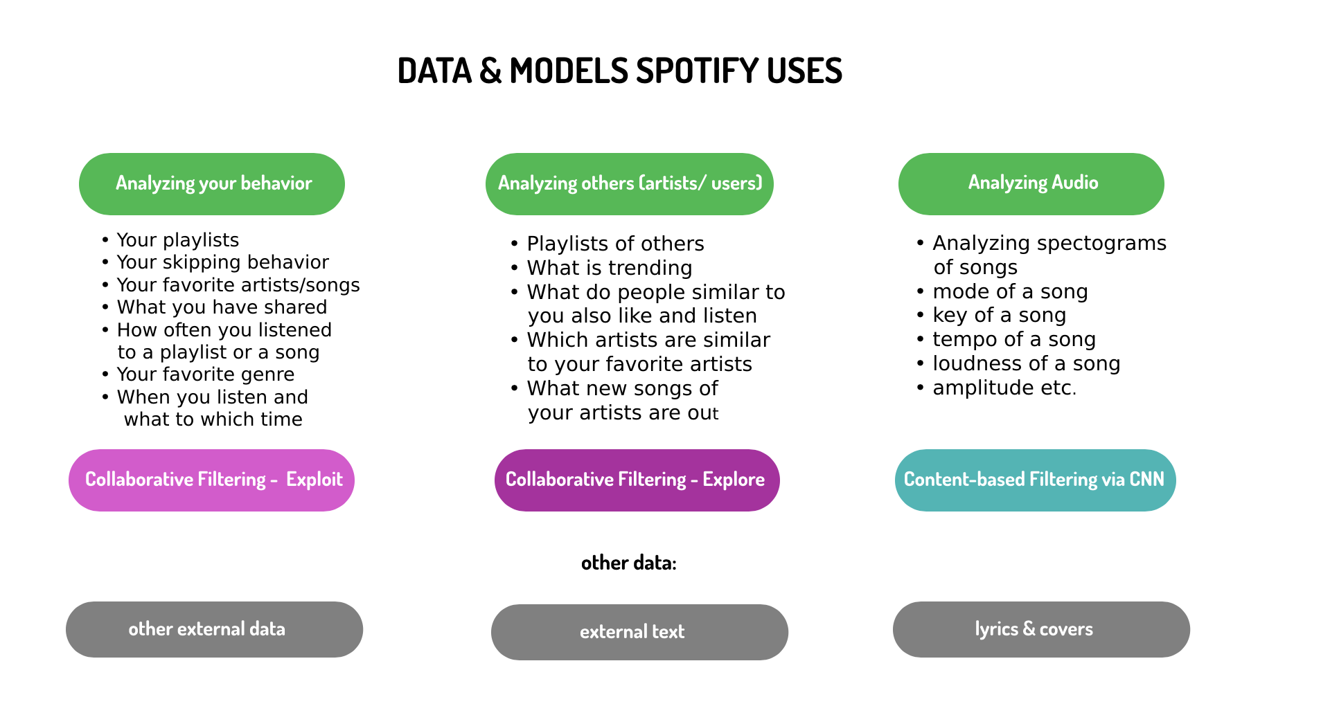 Personalised music recommendations can only happen because of the large amounts of user data available to Spotify. By harnessing this data, Spotify analyses patterns and creates a system where the tracks and users are interlinked.