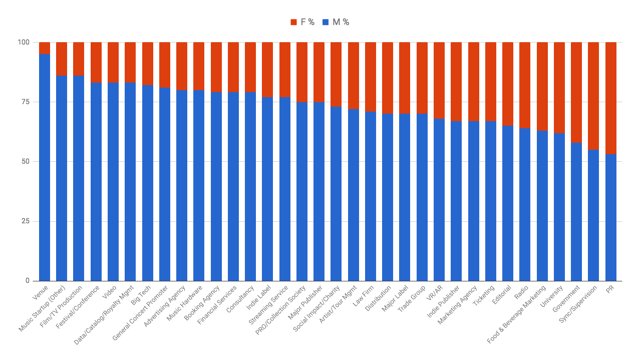 - LIVE EVENTS. This umbrella category includes venues (a staggering 95% male), festivals and conferences (83% male), concert promoters (81% male) and booking agencies (80% male). Ticketing companies have a slightly more equitable representation (67% male), but more often than not are detached from direct interactions with talent. It’s no coincidence that some of the most harrowing, most widely-circulated accounts of sexism in the music industry have originated in live performance and promotion (here, here, here, here), but the extent to which conferences continue to perpetuate this excessive masculine energy is pretty shocking. Especially considering that live events account for a growing proportion of music-industry revenue every year, a growing diversity of music professionals should have stakes in the conversation.