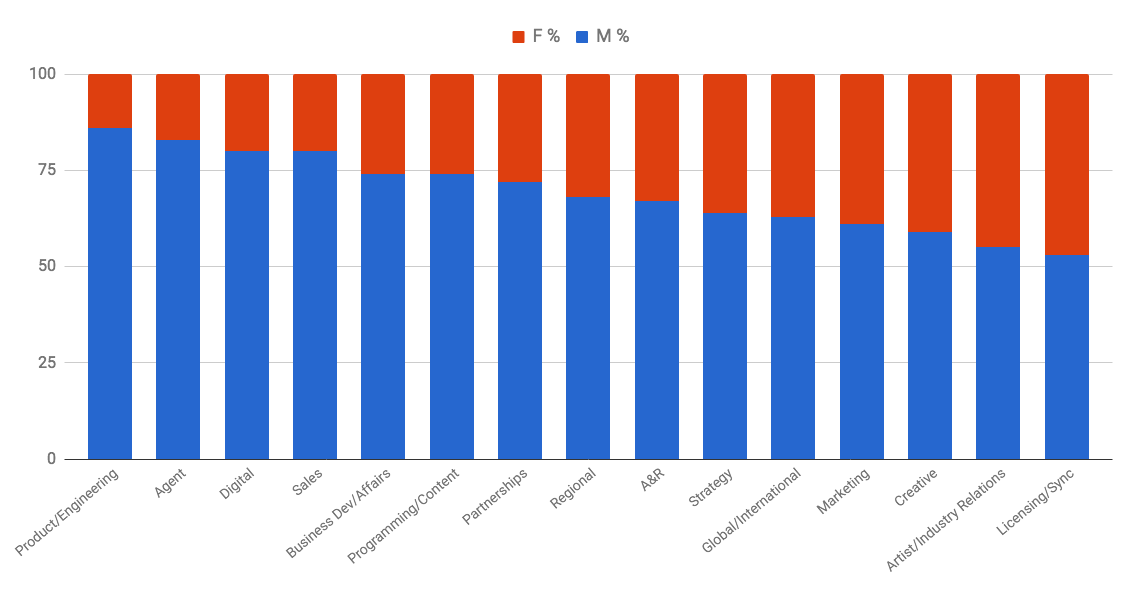 - STARTUPS AND TECH. This includes big-tech firms like Google and Facebook (82% male), hardware manufacturers (80% male), streaming services (77% male), VR/AR studios (68% male) and other music startups (86% male). Given all the recent coverage of sexism and gender inequality in Silicon Valley, and the subsequent ousting and resigning of previously powerful tech executives, this is hardly breaking news. Nonetheless, just as with live music, I think the fact that males are leading the conversation about how streaming and tech are almost singlehandedly responsible for the music industry’s financial recovery is problematic and understated.