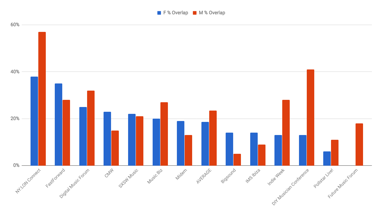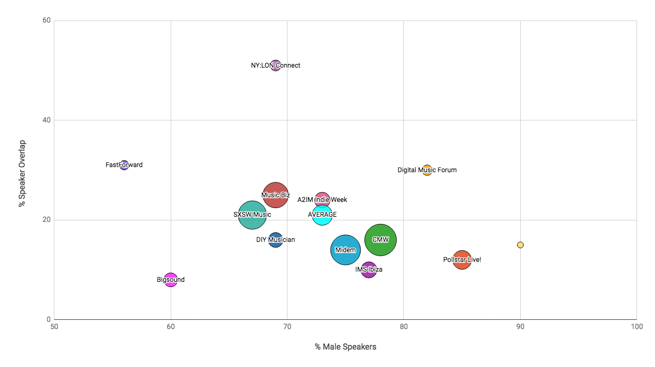 Guest post by Cherie Hu on Medium[Due to the granularity of the graphs you are about to see, this piece is best enjoyed on a desktop!]As a music journalist, and as a genuinely curious human being, I love attending conferences.If that sentence makes you cringe, I completely understand. At their worst, music conferences are time-sucking, self-promotional, useless showcases of bullshit that trade in deflection and avoid any honest conversation about the industry. Unfortunately, most conferences have at least one panel that ends up in this bucket, due to factors both controllable (e.g. booking a panel entirely of male CEOs that lasts only 30 minutes) and uncontrollable (e.g. a panelist shows up stoned or on three hours of sleep after taking a redeye flight from across the ocean).At their best, however, music conferences are vibrant scenes of intellectual inquiry and cross-pollination that scrape this aforementioned bullshit from our eyes. It’s basically the only chance that otherwise siloed stakeholders get to convene in one room, illuminate mutual pain points and growth opportunities, and subsequently make deals that enact meaningful change. I would certainly not be where I am now professionally were it not for attending my first conference back in 2015, and I’ve also made some of my closest friends at these events.For better or for worse, conferences serve as social tokens in business and commercial culture, and particularly in music. As a space we all share, this culture must be taken seriously—and challenged.One axis that I believe is not being taken seriously, hence my writing this article, is gender representation. As a 21-year-old woman passionate about meeting, interviewing and learning from leaders in my field, I am consistently the outlier in a sea of older males. I usually don’t bring it up—I’m frankly used to hanging out with an older, mostly-male crowd at this point, and many of these males have become invaluable, supportive mentors that are the farthest thing away from sexist—but am well aware that gender equality in the music business, and particularly at music conferences, is still a remote fantasy.Moreover, I’ve noticed a recent deluge of anecdotal coverage about sexism and discrimination in the music business, without any quantifiable benchmarks illustrating how significant the magnitude of the problem actually is. Of course, data does not provide the ultimate infallible answer, but people still need numbers to be convinced. Gender equality advocates in Silicon Valley constantly demand more statistics about their industry, and they are slowly but surely achieving the right results. Why shouldn’t the music industry, which supposedly celebrates multifaceted creativity and diversity, follow suit?Interestingly, the few reliable measures I’ve seen on gender in the music industry have all come from across the pond. PRS for Music, one of the largest collection societies in the UK, revealed in its latest Women Make Music report that only 16% of its membership is female. Trade group UK Music recently launched its first-ever Diversity Taskforce, which found that females in the UK music industry account for around 60% of entry-level employees, but only for 30% of senior executives. Back in 2012, the UK’s Association of Independent Music (AIM) found that only 15% of its label members were majority-owned by women.To date, no such measures have been taken in the US, or on a global scale. The likes of Nielsen, the Music Business Association and the RIAA regularly publish gender-related studies about music consumers and fans, but never about music professionals or their own membership.I decided to fill in that gap by quantifying the gender inequality problem at music conferences, the hubs where some of the industry’s most powerful leaders and decision-makers converge to take the pulse on what’s next. Data about who speaks at these conferences is widely and publicly available, but has never really been dissected or critically examined—perhaps because we are afraid to discuss the results.Data Summary
